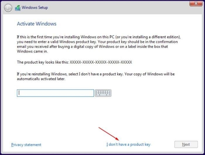 1. Select I don't have a product key (If it doesn't show this don't worry)